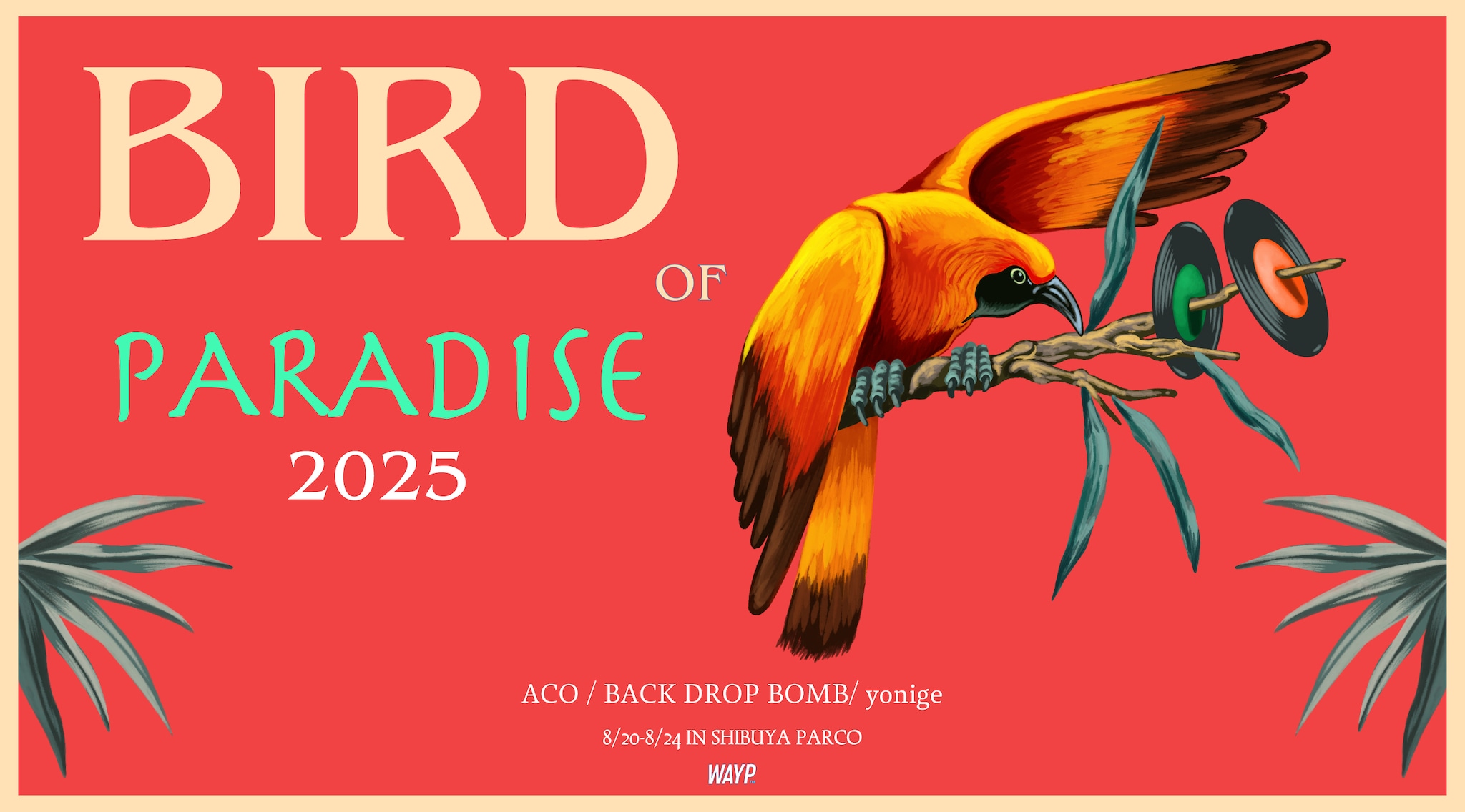 今年で6年目を迎える実在しない音楽フェス「BIRD OF PARADISE’2025」と題したポップアップ今年は30周年を迎えるACOとBACK DROP BOMBそしてyonige と個性豊かな3組のミュージシャンをフィーチャーしTEEをリリースさせて頂きます。